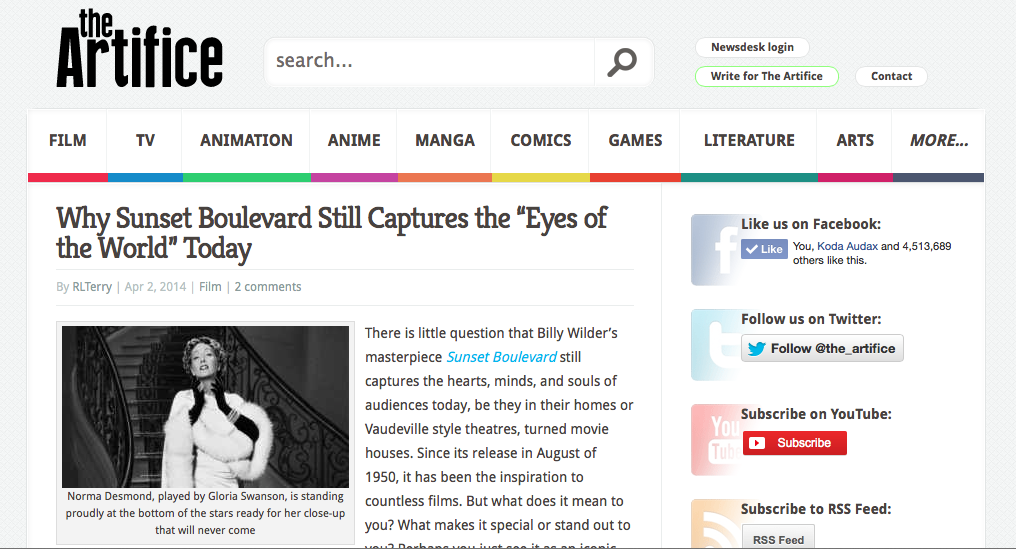 Check out this article I had published on “The Artifice.” Click the link! The name of the article is Why “Sunset Boulevard” Still Captures the “Eyes of the World” Today